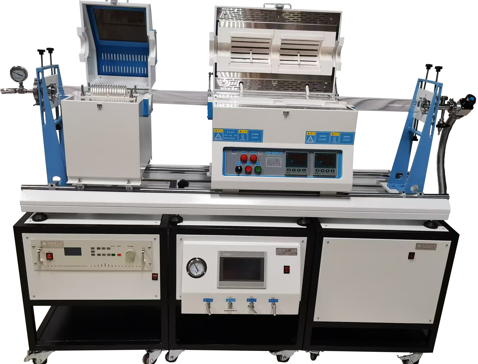 ?爐體可以左右位移 ,射頻電源可以左右位移,爐體和射頻電源同時安裝在同一個滑軌上,使用同一根石英管